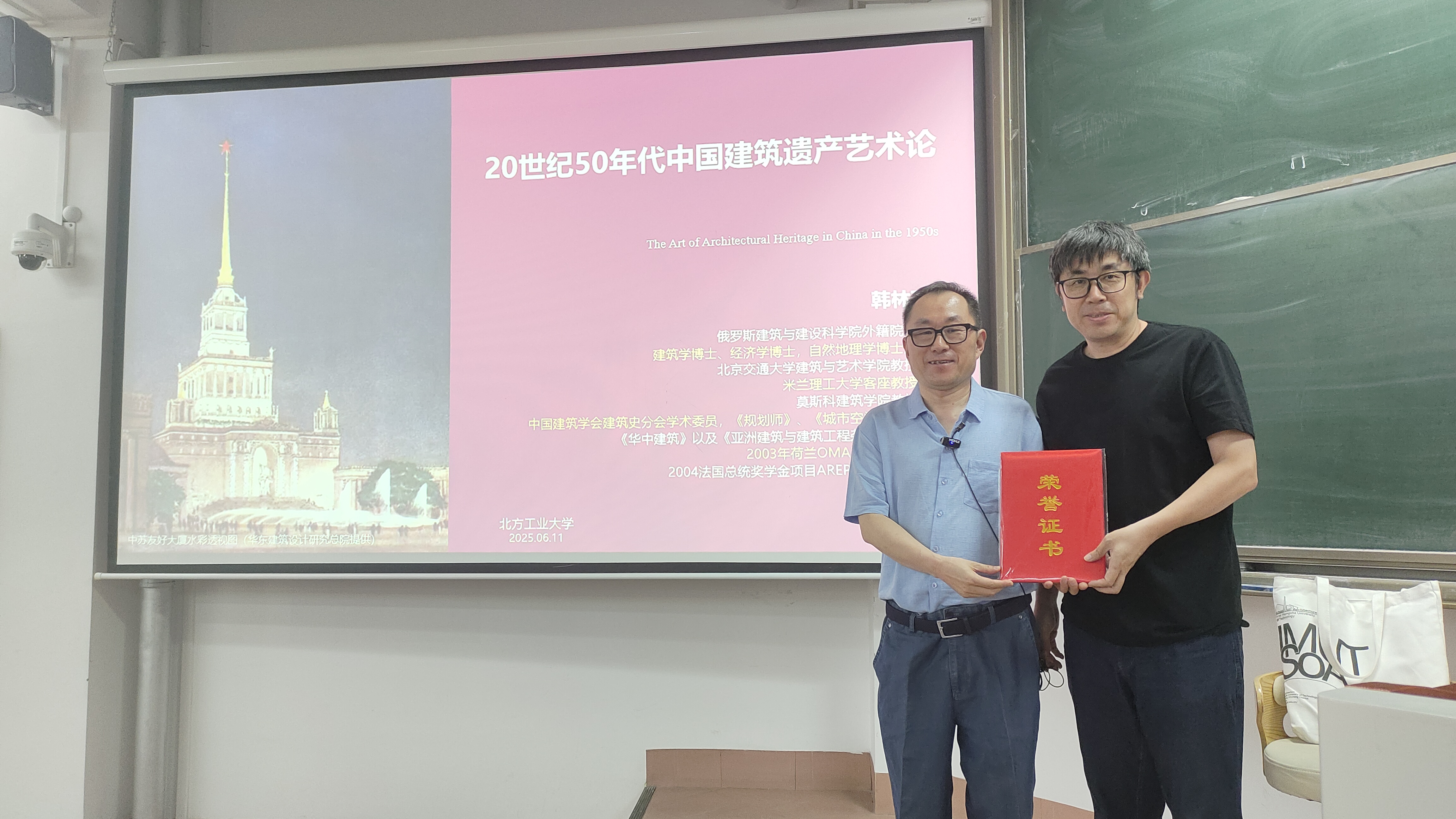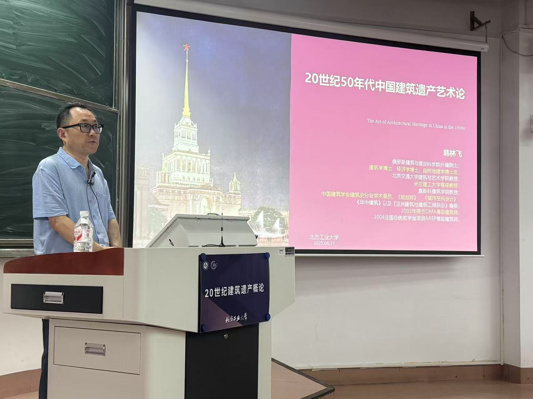 6月11日,应我校建艺学院和中国文物学会20世纪建筑遗产专业委员会联合邀请,俄罗斯建筑与建设科学院外籍院士、北京交通大学韩林飞教授来校讲学,题目为《20世纪50年代中国建筑遗产艺术论》,地点在广学楼西301教室。这是建艺学院胡燕老师开设的全校公选课《20世纪建筑遗产概论》的第八讲。