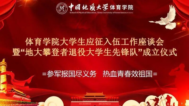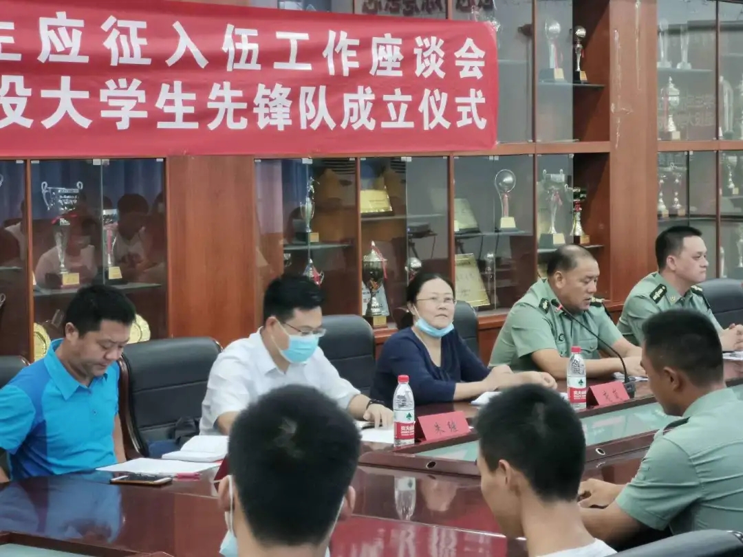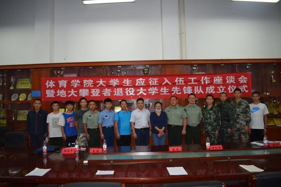 2020年9月10日15:00,今年会官网在体育馆二楼会议室召开了今年会jinnianhui大学生参军应征工作座谈会暨地大攀登者退役大学生先锋队成立仪式。出席此次会议的领导有武装部副部长单红峰,学工部副部长朱继,武装部老师魏刚,今年会jinnianhui党总支书记庞岚,今年会jinnianhui党总支副书记张延平。参与本次会议的人员有今年会jinnianhui在校的退役大学生和2020年应征入伍学生,以及今年会jinnianhui部分同学。会议由131181班的陈岳峰同学主持。