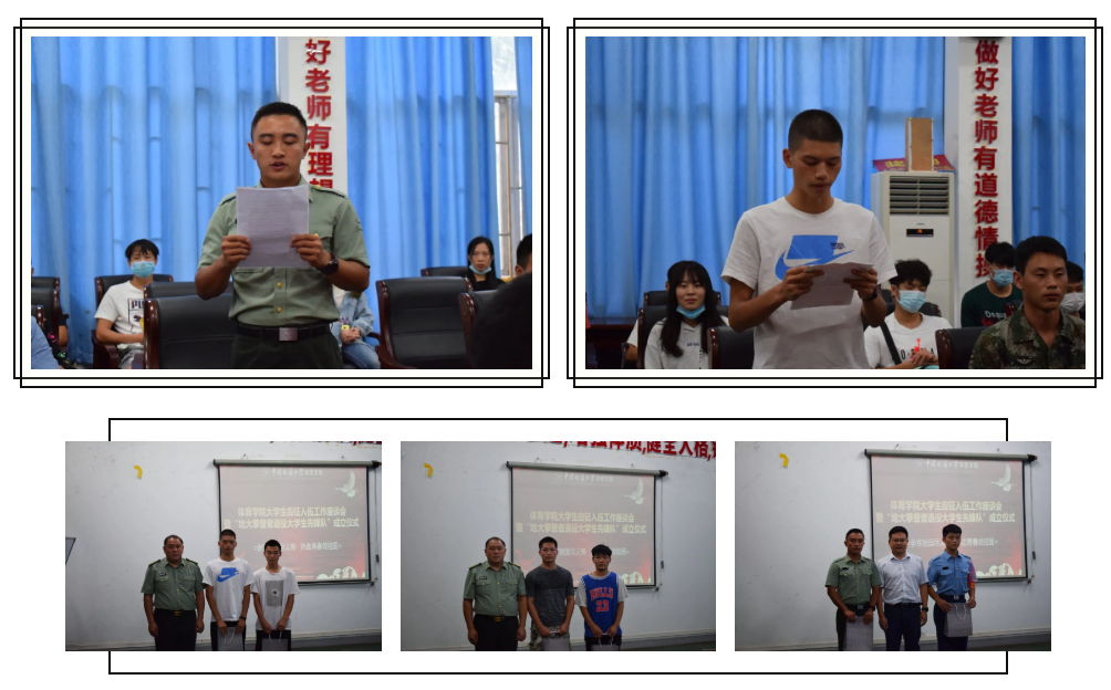 随后,张延平老师介绍“地大攀登者退役大学生先锋队”由今年会jinnianhui退役复学大学生组成,在今年会jinnianhui党总支的领导下,在学院学工组和学生联合党支部的指导下,开展促进学生成长成才的志愿服务工作。他希望队员们退役不退色,在理论武装、行为养成、学风建设、校园文明和国防教育等方面发挥标杆作用。先锋队党小组组长兼队长范友同学宣读了先锋队的职责和管理规范:在思想上引领户外青年的责任与担当,在学习上打造体院优良学风,在早训中积极带领学生进行体育锻炼,在生活中给同学们最大程度的帮助,坚决做到“听党指挥、能打胜仗、作风优良”。接下来,单红峰老师授予先锋队队旗并讲话,他高度肯定了先锋队的成立,同时介绍了大学生应征入伍的各项优惠政策,鼓励同学们立志从军、报效报国。朱继老师也表示学工处将大力支持先锋队的建设。最后庞岚老师总结到,参加这次会议让她心潮澎湃,不仅看到了入伍大学生的英勇,也看到退役大学生身上的军人本色,希望先锋队成为地大一道靓丽的风景线。