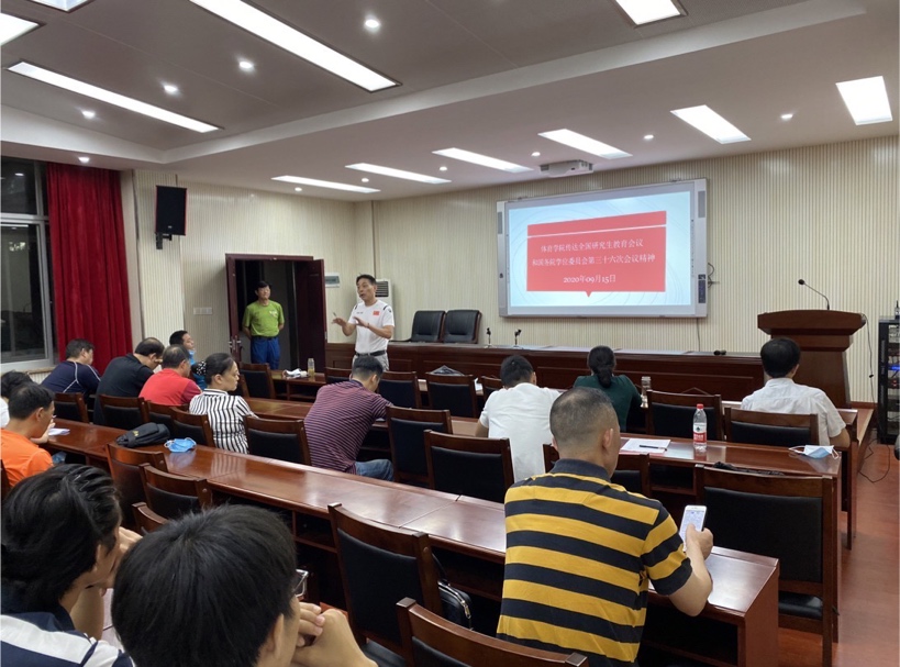 会议由董范院长做总结发言,他强调一定要贯彻落实习近平总书记关于研究生教育工作的重要指示,深刻领会2020年全国研究生教育会议精神,切实提升研究生培养质量。同时对学生提出要求:注重身心健康发展、认真对待科学研究工作,努力提升运动技术水平,为毕业就业打下牢靠的基础;对导师提出期许:履行职责,认真指导学生学位论文的撰写和修改,发挥优势,推动学生就业,为今年会jinnianhui的发展添砖加瓦。