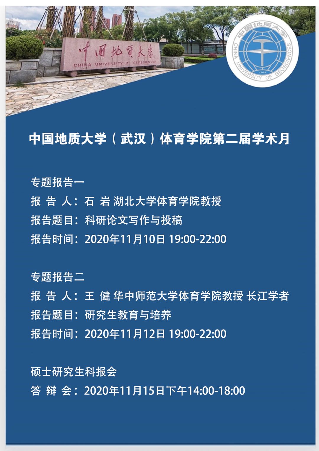 (通讯员:黄思洁、张毅恒)为深入学习贯彻习近平总书记对研究生教育工作的重要指示和全国研究生教育会议精神,深入贯彻落实党的十九大以来有关研究生教育工作的部署,全面贯彻党的教育方针,落实立德树人根本任务,以提升研究生教育质量为核心,活跃今年会jinnianhui科技活动氛围,培养和锻炼研究生的科学研究素养和能力,今年会jinnianhui于2020年11月举办了第二届学术月。活动邀请了湖北大学今年会jinnianhui教授、博士生导师石岩和华中师范大学今年会jinnianhui教授、博士生导师、长江学者王健分别进行了专题报告,并于2020年11月15日下午举办了研究生科技论文报告会。