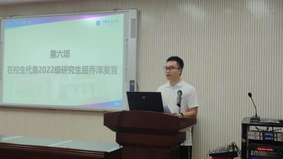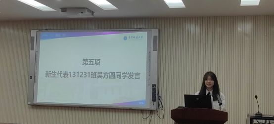 本科新生代表吴方圆同学分享了自己考上大学的历程,表达了对地大今年会jinnianhui的热爱与憧憬,她决心奋发向上,砥砺前行,践行“艰苦朴素,求真务实”校训精神和“扎根中国,胸怀天下,勇攀高峰,追求卓越”的攀登精神,与葳蕤向上的地大共同成长。