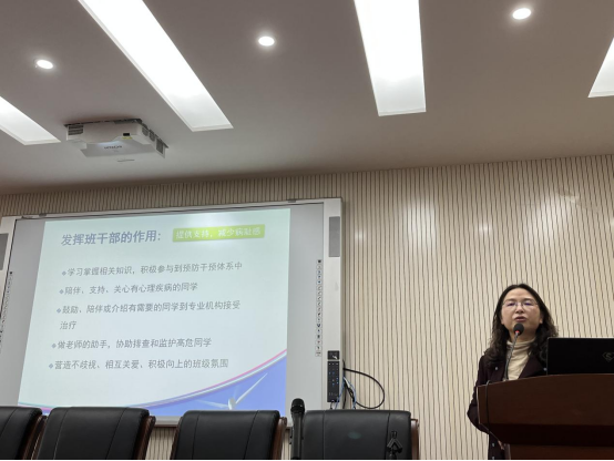 刘陈陵老师为全体学生干部做“发挥学生干部的作用,共同营造心理支持环境”专题讲座,从心理疾病概况和预防干预对策出发,强调学生干部在危机干预中的重要作用,引导学生干部学习掌握相关心理健康教育知识,积极参与到预防干预体系中,营造不歧视、相互关爱、积极向上的班级氛围。