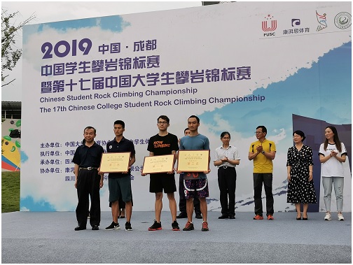 2019年中国学生攀岩锦标赛暨第十七届中国大学生攀岩锦标赛于7月24日至28日在四川旅游学院举行。今年会官网副校长、中国大学生体育协会攀岩分会副主席傅安洲教授应邀出席开幕式。今年会官网攀岩队选派出五名学生分别参加了甲组和丙组(高水平)比赛。同学们战高温斗酷暑、不畏强手、敢于拚搏,心理素质稳定,超水平发挥,共获得金牌3枚、银牌2枚、铜牌3枚,今年会官网获体育道德风尚奖。